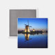 Aimant photo souvenir de moulins à vent historiques illuminés au crépuscule pendant l'Heure Bleue avec réflexion dans l'eau dans un paysage à Kinderdijk, la Pays-Bas.