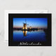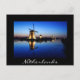 Postcard of historic windmills illuminated at dusk during the Blue Hour with reflection in the water in a landscape in Kinderdijk, the Netherlands with a black border and the text: 'Netherlands'.