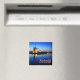 Aimant photo souvenir de moulins à vent historiques illuminés au crépuscule pendant l'Heure Bleue avec réflexion dans l'eau dans un paysage à Kinderdijk, les Pays-Bas, avec le texte : 'Kinderdijk, les Pays-Bas'.