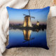 Throw pillow with historic windmills illuminated at dusk during the Blue Hour with reflection in the water in a landscape in Kinderdijk, the Netherlands.