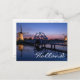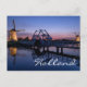 Carte postale de deux moulins à vent illuminés et un pont-levis avec réflexion dans l'eau du canal à la dernière lumière au coucher du soleil à Kinderdijk dans la Pays-Bas avec le texte : 'Holland'.