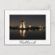 Postcard of a landscape with multiple windmills, illuminated at night, with reflection in the still canal water in Kinderdijk, the Netherlands with a white border and the text: 'Holland'.