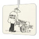 A window cleaner has his own window cleaning business and is pushing his barrow, or cart, with a ladder and bucket. On the back of his jacket he has the words Managing Director. Funny cartoon by UK cartoonist, Nigel Sutherland. Gift for a window cleaner.