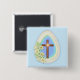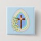 Glowing wooden Cross is framed with white Lillies and window egg to symbolize rebirth. The background is a lovely aqua shade. A lovely symbolic religious design.