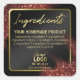 Ingredient labels with a red windswept glitter design on black with a touch of luxurious gold.