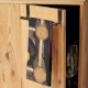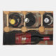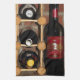 This kitchen towel features a wine rack and an upright bottle of wine set against a brick wall. The closeup creates an interesting abstract pattern of red, black, yellow, brown and orange.