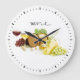 Elegant wine-themed clock for a wine connoisseur. The clock features wine, grapes, and cheeses for an appetizing design! Perfect clock for a kitchen nook, dining area, or a home wine bar.