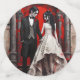 A Gothic Wedding couple dressed in wedding attire standing under a Roman archway. The background is dramatically painted in shades of red, evoking a sense of blood splatter, which adds a dark and eerie atmosphere to the scene. The groom is wearing a black suit with a red boutonniere, and his hair is styled in a sleek, gothic manner. The bride is in a white dress adorned with intricate patterns, her long dark hair complementing the gothic theme. Both characters have pale complexions and an ethereal presence, further emphasizing the gothic esthetic. The overall mood is a blend of romance and macaber, characteristic of gothic art.
