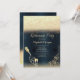 Elegant glitter wine glass and bottle on a gold glitter bokeh and navy blue background.