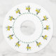 Blossoms form a circle outside of a scalloped green line. One side is yellow daffodil blossoms the other side is orange calendula blossoms.