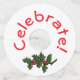 Green holly branches with red berries on one side. Reverse shows one branch of holly and the curved text "Celebrate!" in red.