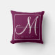 Personalized wine purple, grey and white monogrammed pillow with your bride and groom names and wedding date in a script font overlay design on a solid colour background. Elke Clarke© Makes a great gift for newly weds. Available at www.zazzle.com/monogramgallery. Makes a great gift for newly weds. Great trendy, elegant accessory for your bedroom, favourite chair, fun home decor in your family room or formal decorative addition to your living room. Other styles and colours available in our shop. Customize with your names, monogram initial and wedding date.
