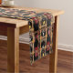 This contemporary table runner features a repeating abstract pattern of upright red and black bottles of burgundy wine next to more bottles in a brown, gold and yellow wooden wine rack. A rustic orange brick wall background completes the composition.