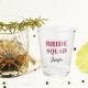 A great barware gift for the wedding bridesmaid squad attending a bachelorette party! Shot glass features modern style lettering with the words "Bride Squad" printed in a wine red color along with bridesmaid's name printed in black, stylized script. Select from many, popular bridal party color schemes. Personalize your shot glass by editing and replacing bridesmaid's name.
