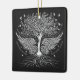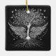 Metallic silver set of wings, tree and roots symbolizing wings to fly with details of birds, hearts and flowers on a black background. Artwork features wording, “Give the ones you love wings to fly, roots to come back and reasons to stay. She flies on her own wings. Rooted in love, she blooms.” Christmas Tree Ornament
