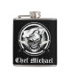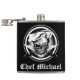 A cool and funny winking chef skull with crossed chef knives, against a black background. Add your name, for a personalized touch.