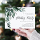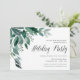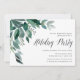Elegant and festive holiday party invitations feature watercolor eucalyptus leaves and green foliage cascading from the upper left corner. Customize with your Christmas celebration details aligned at the right, embellished with "Holiday Party" in chic calligraphy script lettering. Invitations reverse to solid forest green.