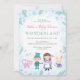 Ever so cute Winter Alice in Wonderland winter theme baby shower invitations! This adorable design features a Alice, the Mad Hatter, White Rabbit, and Cheshire Cat in a winter wonderland, all from Lewis Carroll's classic book.