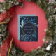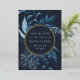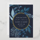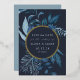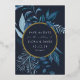 Notre Winter Azure enregistrer la carte de date entoure vos détails mariages avec une bordure circulaire de feuillage d'aquarelle vibrante dans les tons vinicoles de bleu poussiéreux, bordée de feuille d'or sur un riche arrière - plan bleu minuit. Un choix moderne mais organique pour les mariages d'hiver avec des éléments botaniques peints de manière complexe.
