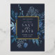 Notre mariage Winter Azure sauvez la date encadre vos détails mariages avec une bordure carré élégante de feuillage d'aquarelle glacée dans les tons bleu marine et bleu poussiéreux, avec de véritables garnitures en feuille d'or sur un riche arrière - plan bleu minuit. Un regard moderne et élégant sur la tendance botanique.