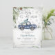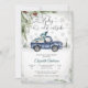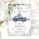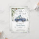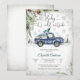 Celebrate in cozy style with this charming winter baby shower invitation featuring a watercolor blue vintage truck carrying a Christmas tree and gifts. Snowflakes, pine branches, and evergreen trees create a festive seasonal backdrop, while the elegant "Baby its cold outside- script adds a whimsical touch. Perfect for winter celebrations, this customizable design blends rustic charm with holiday cheer, making it ideal for honoring parents-to-be during the colder months.