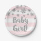 Winter theme baby shower party plates in light pink and white stripes pattern with silver snowflakes and text.