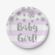 Winter theme baby shower party plates in light purple and white stripes pattern with silver snowflakes and text.