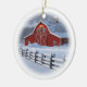 Christmas tree ornament featuring a beautiful red barn in a wintery ranch scene.
