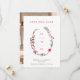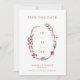 A modern winter wedding save the date announcement featuring a watercolor asymmetric open wreath made up of colourful berries red, blue and brown, with green leaves. Personalize with your details in front and your photo on the reverse.