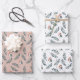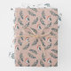 This pretty gift wrapping sheet set features a watercolor pattern of green leaves and a pert little winter bird. Two sheets of the paper have the image printed on a white background, while the third sheet has the same image on a pale grey orange background. Together, they make a nice contrasting gift package display, which is appropriate for the Holiday season, birthdays, weddings, showers, or any occasion at any time.
