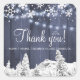 Editable text favour sticker featuring rustic white snowflakes, three small hearts, a mountains landscape and twinkle hanging lights with a white editable thank you script on dark blue grey barn wood background. Ideal for your winter elegant rustic seasonal wonderland themed wedding, baby shower or other occasions.