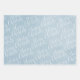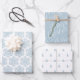 Christmas gift wrapping paper set feature modern calligraphy merry Christmas script, bold snowflakes and Christmas trees in winter blue and white.