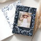 Elegant folded Hanukkah photo card features a favourite photo surrounded by a border of delicate blue botanical foliage and tiny watercolor flower blossoms on a rich navy background. Your custom holiday greeting and family name or names appear beneath your photo in chic white lettering. Add a custom pre-printed message to the inside.