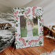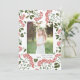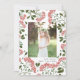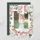 Elegant holiday photo card features a favorite photo surrounded by a border of lush green botanical foliage and tiny red watercolor flower blossoms. Your custom holiday greeting and family name or names appear beneath your photo in chic grey lettering. Personalize the back with two additional photos and a personal message against a hunter green background.