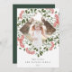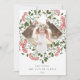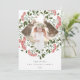 Elegant holiday photo card features a favorite photo surrounded by a geometric border of lush green botanical foliage and tiny red watercolor flower blossoms. Your custom holiday greeting and family name or names appear at the bottom in chic gray lettering. Personalize the back with two additional photos and a personal message against a hunter green background.