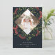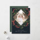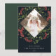 Elegant holiday photo card features a favourite photo surrounded by a geometric border of lush green botanical foliage and tiny red watercolor flower blossoms on a rich navy background. Your custom holiday greeting and family name or names appear at the bottom in chic white lettering. Personalize the back with two additional photos and a personal message against a hunter green background.