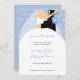 Winter Save the Date cards with a bride and groom on a snowflake background.