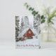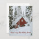 Winter cabin in the wilderness holiday greeting card. Red cabin and snow covered trees.