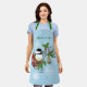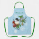 A chickadee perches on a snow-dusted tree branch in this winter illustration. Christmas holly and the little bird is surrounded by two holiday ornaments—one round and one teardrop-shaped—both adorned with festive patterns and rich seasonal colours. Snowflakes and snow falling all around in a backdrop of light blue.