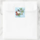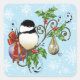 A chickadee perches on a snow-dusted tree branch in this winter illustration. Christmas holly and the little bird is surrounded by two holiday ornaments—one round and one teardrop-shaped—both adorned with festive patterns and rich seasonal colours. Snowflakes and snow falling all around in a backdrop of light blue.