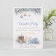 Winter gathering design featuring soft blue and ivory tones, pine garland with ornaments, and light snow texture. Detailed accents include lace-up boots, knit hat, and hot cocoa mug with candy canes. Script headline with clean layout suited for hosting a seasonal home party.