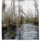 Beautiful image from the Okefenokee Swamp during winter in Fargo, Georgia. Cypress trees rise up from the swamp as a small boat of tourists explore the inky waters.
