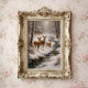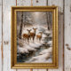 Three deer standing beside a quiet forest stream in a snowy winter landscape. Soft natural tones and a peaceful woodland atmosphere create a calm seasonal nature scene.