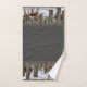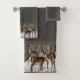 A rustic bath towel set perfect for a cabin in the woods or other country decor. The bath and hand towels feature an image I took of white tail deer in the woods soon after a new snow on a dark background with pine cones. The coordinating washcloth is the same dark background with pine cones and framed with a matching diamond pattern