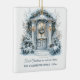 A square ceramic Christmas ornament featuring a beautiful watercolor-style illustration of a front door decorated for the holidays. The entryway is adorned with a festive wreath, snow-dusted trees, and a peaceful winter scene, symbolizing warmth and celebration in a new home. Below the artwork, customizable text reads “First Christmas in our new home” and “NAME FAMILY – 20xx”.You can customize it with your text. This ornament makes a thoughtful keepsake for families celebrating their first Christmas in a new house.