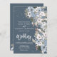 Winter pretty hand painted winter wonderland theme wedding invitation. Featuring beautiful white anemones, peonies, and dusty blue flowers, with dark green eucalyptus branches with white snow on editable dark dusty blue background and an elegant and modern brush script font. Perfect for autumn winter, Christmas weddings.