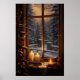 The "Winter Evening with a Warm Candlelit Window Poster" transports viewers to a serene scene where the quiet beauty of a snowy evening is illuminated by the gentle glow of candlelight. This captivating artwork captures the essence of coziness and tranquillity, inviting viewers to embrace the warmth and comfort of a winter's night.
