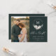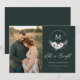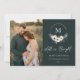 All is Bright signature script. Rustic winter watercolor white floral, pine branches and pinecones hoop monogram frame, photo holiday card. Coordinating rustic forest green colour backgrounds.