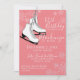 Vintage ice skates hanging by their laces among a collection of pretty sparkling snowflakes. Winter Birthday skate party invitation for 12th birthday or any age at all with your choice of background colours and font styles through further customization. Girls white leather ice skate and delicate snowflakes sports theme design with coral pink and teal retro colour scheme and white hand script and formal font styles.