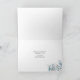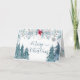 Personalized christmas card with elegant script typography. Watercolor design with pine trees, poinsettia and winter foliage in shades of blue grey and tidewater green.